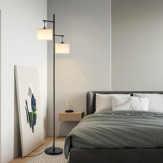 ZMH ZMH Stehlampe Wohnzimmer Modern Stehleuchte - Schwarz E27 Standleuchte Vintage 2 Flammig Bettlampe Weiß Stoff Design Standlampe Boho Deko Leselampe Max.25W mit Fußschalte für Büro Schlafzimmer