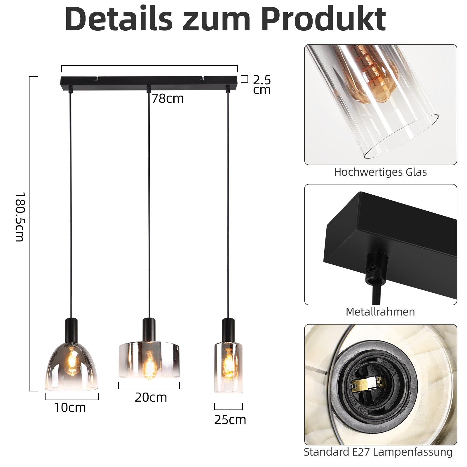 H?ngelampe Esszimmerlampe 3 Flammig H?ngeleuchte- E27 Vintage Esstisch Pendelleuchte H?henverstellbar Glas Schwarz Pendellampe H?ngend f¨¹r Schlafzimmer k¨¹che (ohne Leuchtmittel)