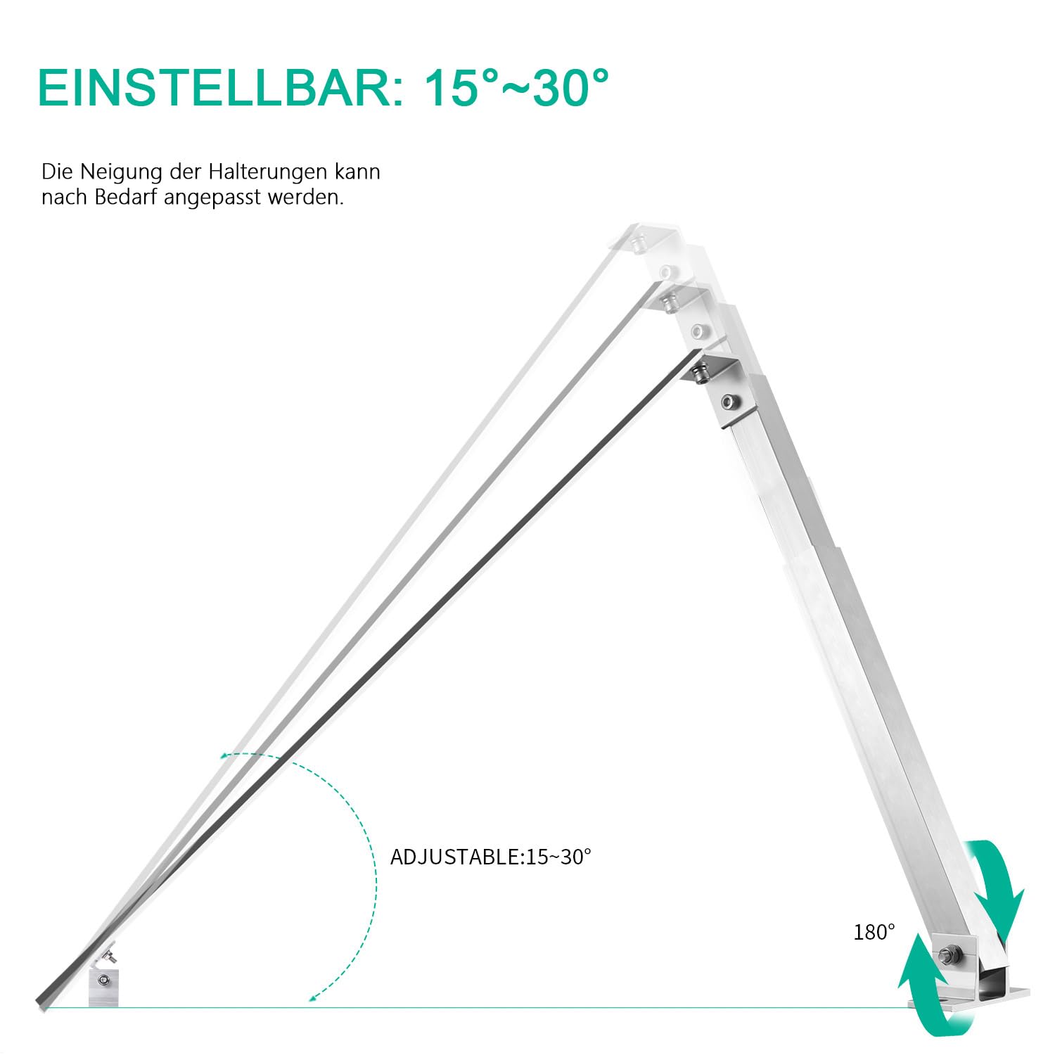 Die Komponenten des Gestells sind verstellbar, sodass Sie die Solarmodule flexibel positionieren k?nnen. Sie k?nnen den optimalen Winkel zur Sonne f¨¹r jede Jahreszeit einstellen und so perfekt von der Sonnenenergie profitieren.